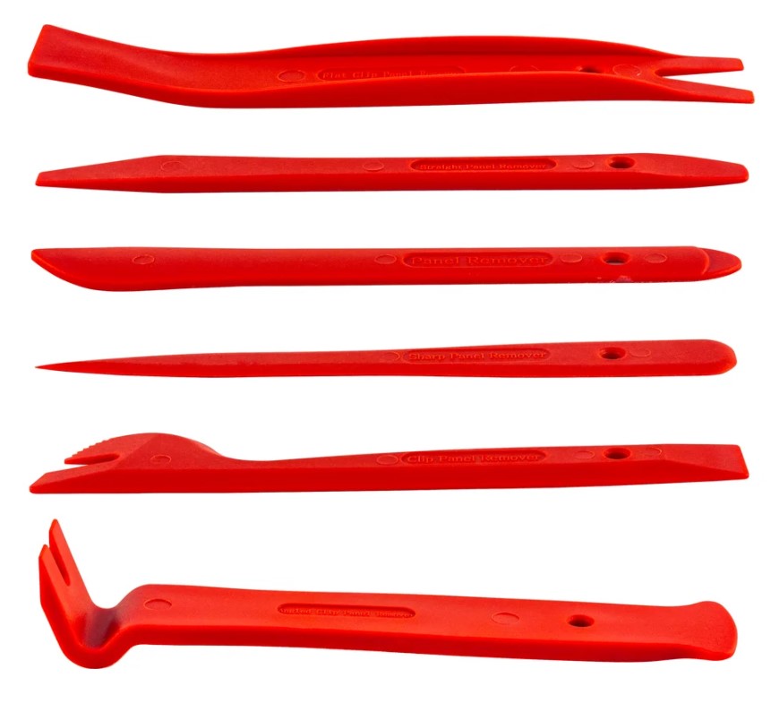 Набор приспособлений для демонтажа декоративных панелей салона автомобиля из 6 предметов. Инструменты, входящие в состав набора, применяются для демонтажа внутренних декоративных панелей салона автомобиля. Особая форма съемников предназначена для снятия панелей без повреждений. Специальный материал.