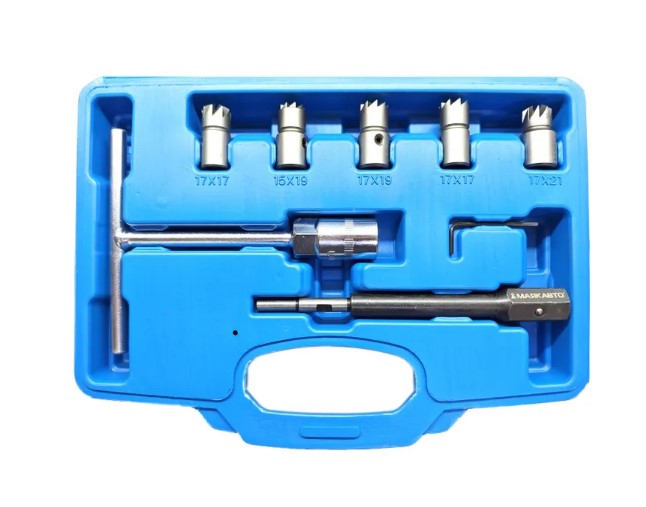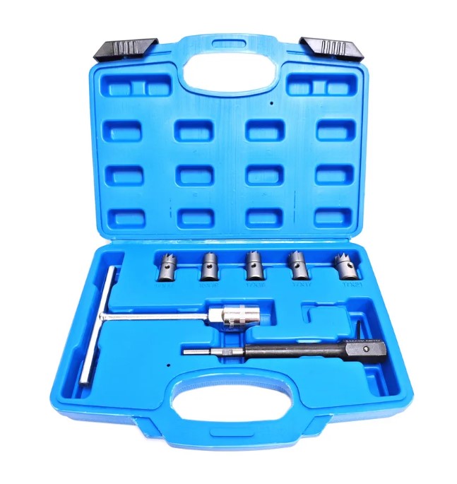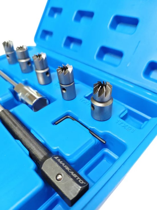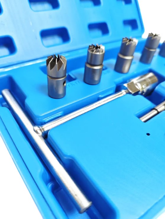 Комплект инструментов для очистки посадочных мест топливных форсунок в дизельных двигателях.