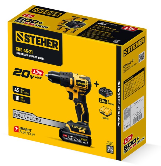 Двухскоростной планетарный редуктор позволяет выбирать режим работы. Ударная функция сверлит легкий бетон. Бесключевой патрон упрощает замену насадок.