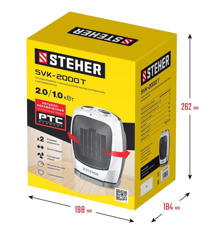 Тепловентилятор STEHER SVK-2000T мощностью 2 кВт оснащен современным металлокерамическим нагревательным элементом. Он обеспечивает быстрый и эффективный обогрев помещений.