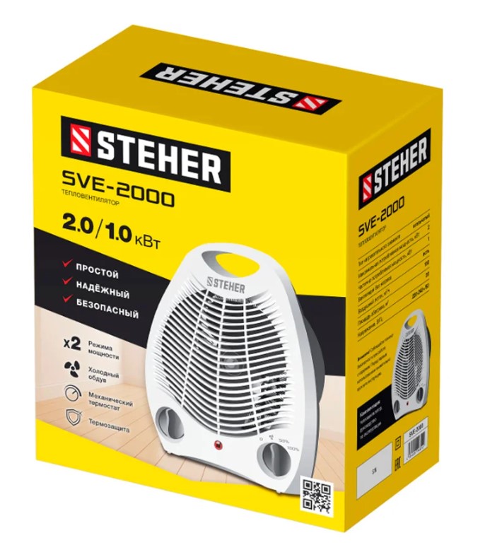 Тепловентилятор STEHER 2 кВт SVE-2000 оснащен высокоэффективным игольчатым нагревательным элементом мощностью 2000 Вт.