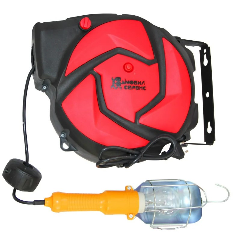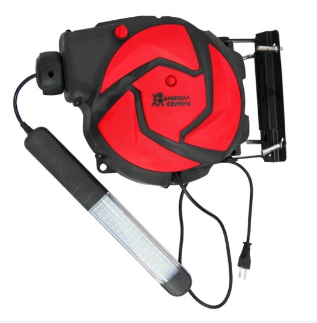 Светильник оборудован закрытой автоматической катушкой сматывания со шнуром длиной 15 м, оснащен вилкой для подключения в электросеть, металлической решеткой для защиты лампы, выключателем на ручке и кронштейном для крепления к стене или полу.
