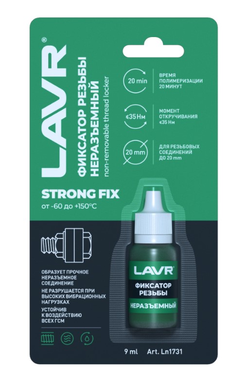 Надежно фиксирует резьбовые соединения до 20 мм, валы и втулки в посадочных отверстиях, подшипники без прессовой посадки. Полимеризуется в зазорах резьбы за 20 минут без доступа воздуха. Окончательная прочность достигается через 24 часа при температуре от +18°С. Рабочий температурный диапазон составляет от -60 до +150°С. Момент откручивания на незатянутой винтовой паре до 35 нм. Устойчив к воздействию воды, солей, антифриза, любых топлив и газов.