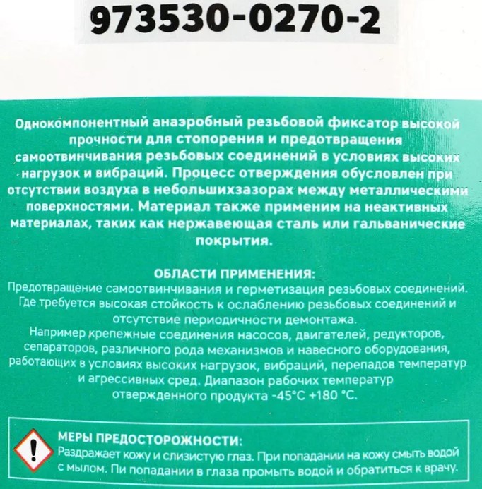 Экстремальная прочность (28–42 Нм) позволяет надёжно фиксировать соединения даже при сильных вибрациях. Широкий температурный диапазон (от -60 до +180 °C) обеспечивает работоспособность в любых условиях. Универсальность применения — подходит для нержавеющей стали и гальванических покрытий. Большой объём (250 мл) позволяет использовать продукт в профессиональных целях с максимальной экономией. Долговечная фиксация — не требует регулярного обслуживания соединений.