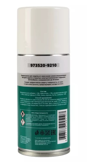 Защитный аэрозоль для клемм аккумулятора GARWIN PRO 973520-9210 — Лак для защиты клемм используется для защиты контактов аккумуляторной батареи, а также другого электрооборудования автомобиля. Создает на поверхности прочное термостойкое покрытие, защищающее контакты от окисления и коррозии. Позволяет уберечь от падения напряжения, тем самым продлевая срок службы АКБ. Обеспечивает надежный пуск двигателя.