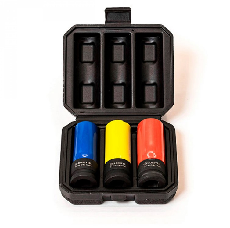 Набор ударных головок с тонкими стенками ST134 1/2″, 17,19,21 мм, оснащённых цветными пластиковыми втулками, предназначен для работы с литыми дисками автомобилей с помощью пневматических и электрических гайковёртов.