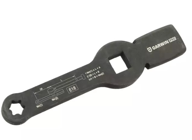 Ключ используется для снятия-установки тормозного суппорта дисковых тормозов грузовых автомобилей MAN серий TGL и TGM. Квадрат 3/4 дюйма предназначен для закручивания крепежных болтов, формула расчета момента отпечатана на самом ключе.