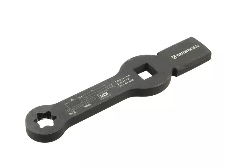 Ключ используется для снятия-установки тормозного суппорта дисковых тормозов грузовых автомобилей DAF моделей XF, XF95, XF105 и XF106. Квадрат 3/4 дюйма предназначен для закручивания крепежных болтов, формула расчета момента отпечатана на самом ключе.