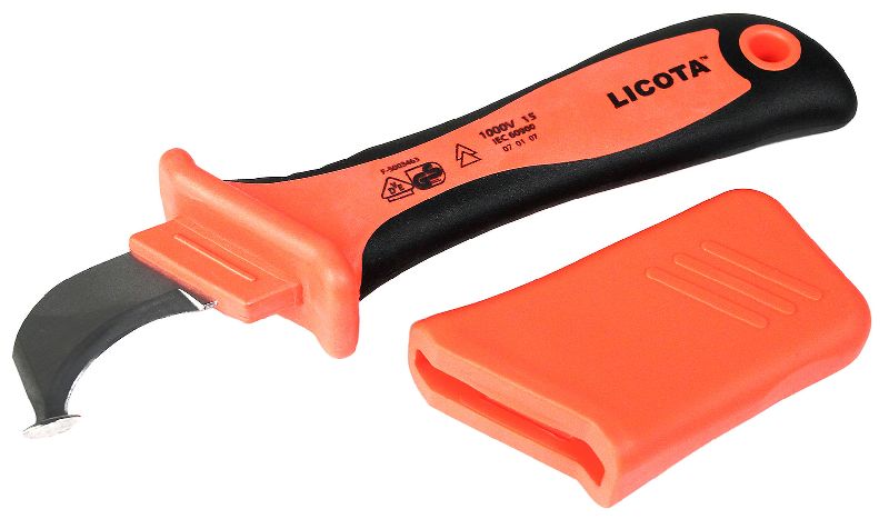 Нож оснащён изолированным лезвием и имеет специальные пластиковые ножны, которые защищают лезвие от повреждений.