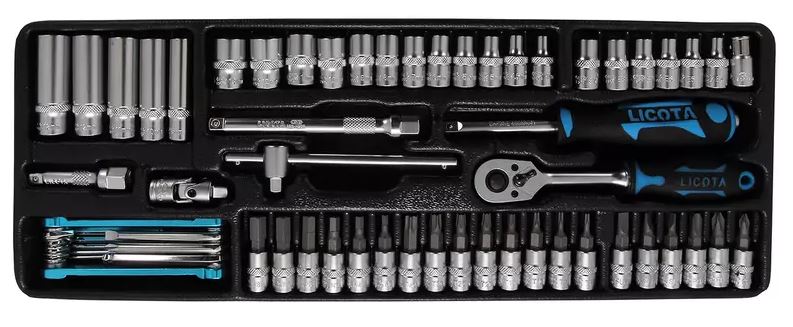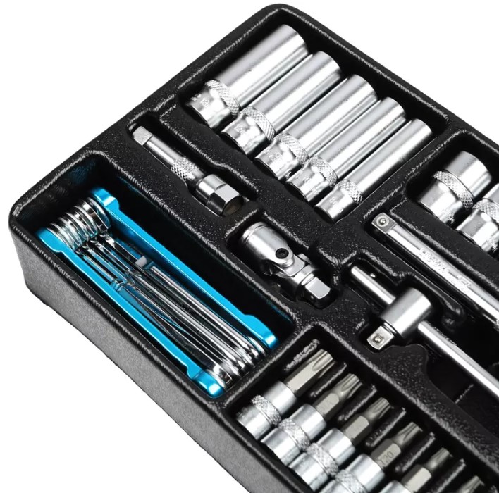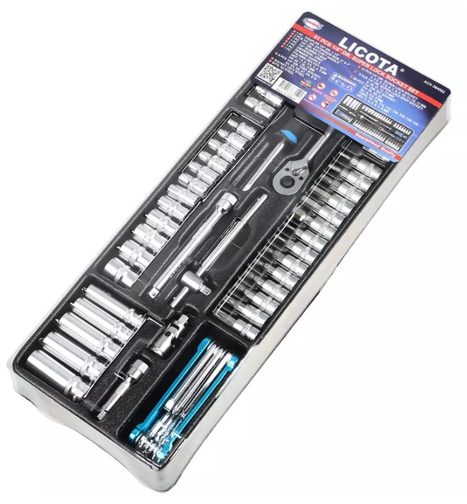 Набор торцевых головок Licota ACK-384002. В комплект входит 51 предмет, предназначенный для ремонта и обслуживания автомобилей. Он включает головки для разборки и сборки салона, электрические головки и головки для работы с мелким крепежом в двигателе. Размер приводного квадрата составляет ¼ дюйма. Комплект поставляется в удобном пластиковом ложементе.