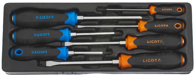 Набор отверток Licota ACK-384108 состоит из 7 предметов, удобно расположенных в ложементе. В наборе есть 4 отвертки с профилем SL (шлиц) и 3 отвертки с профилем PH (крест), что позволяет работать с различными типами крепежа.