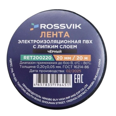 Изолента ПВХ 20 мм*20 м черная ROSSVIK