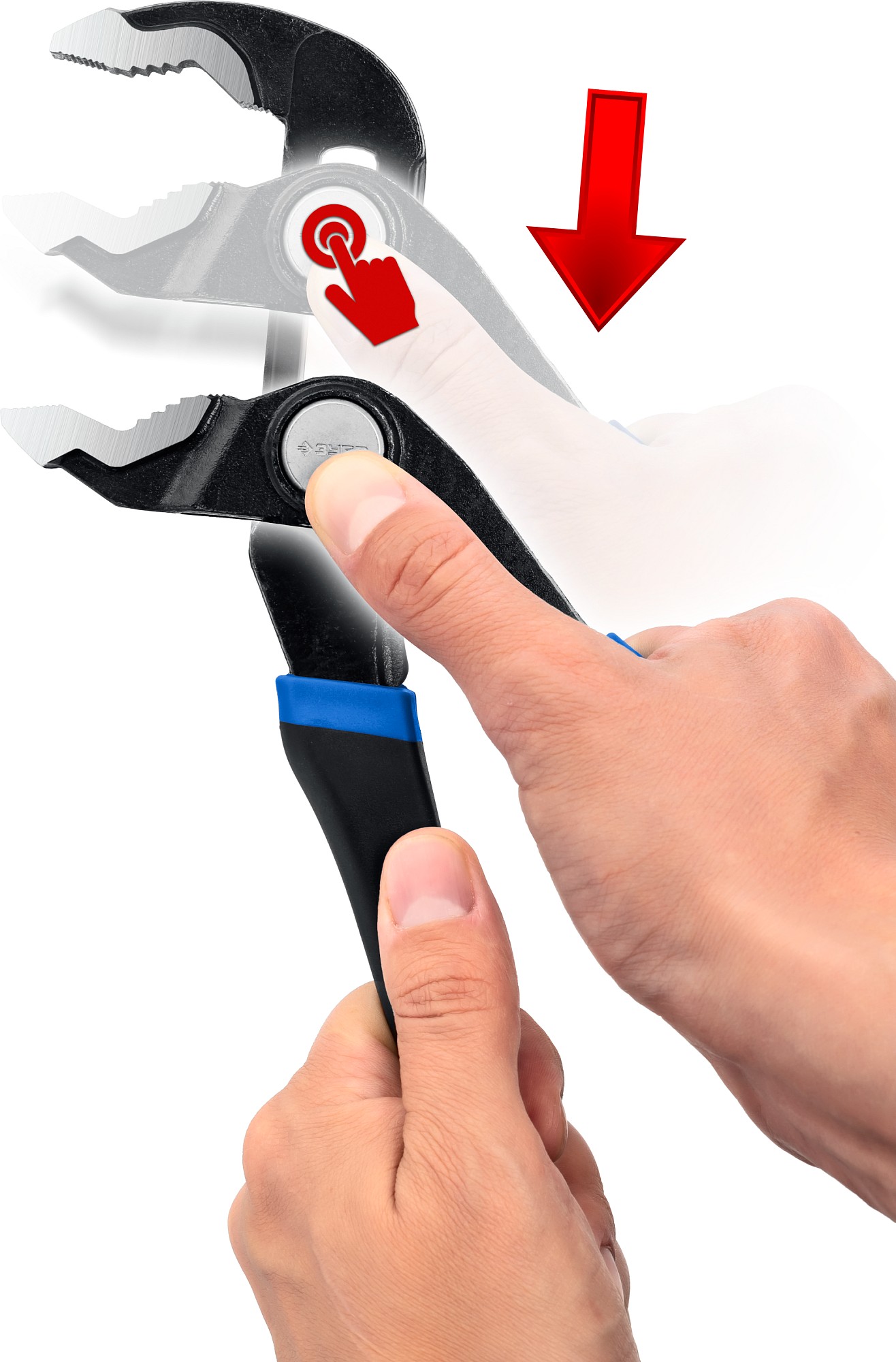 Уникальная конструкция шарнира с кнопочным фиксатором обеспечивает быстрый подбор ширины зева.