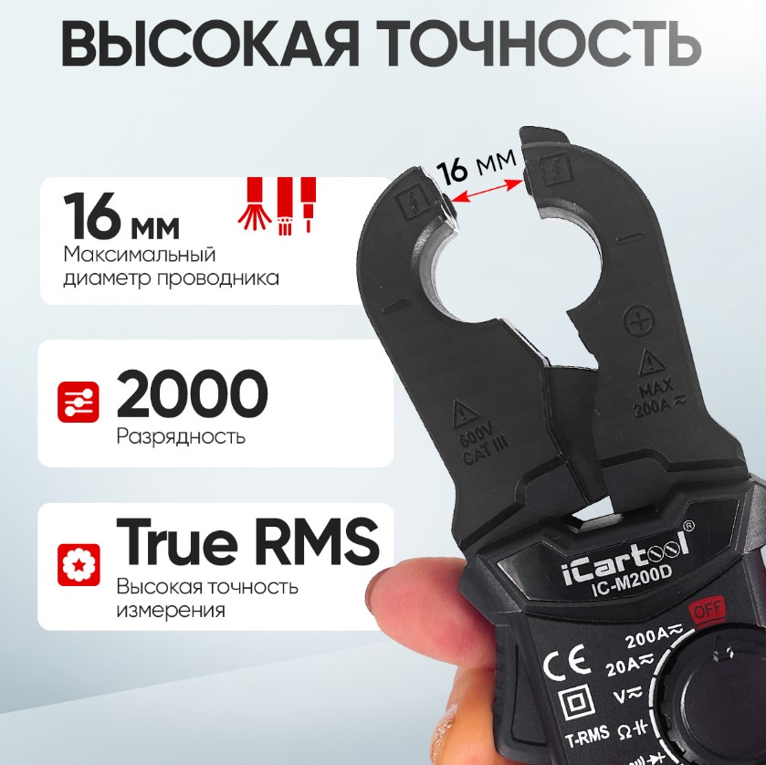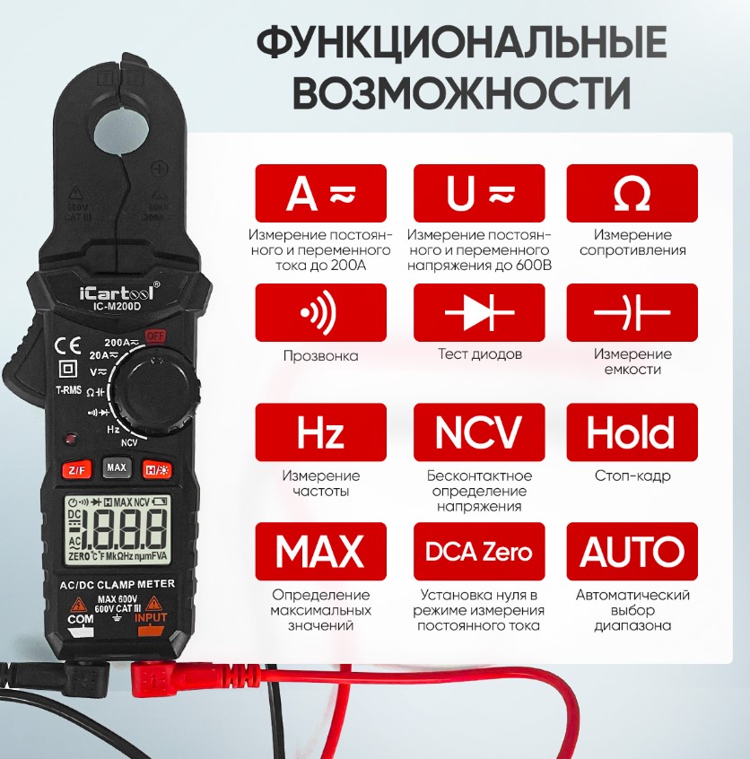 Токовые клещи iCartool IC-M200D предназначены для измерения постоянного и переменного тока до 200А. Они соответствуют электробезопасности CAT III 600V и отличаются высокой точностью и стабильностью измерений. Эти клещи также включают в себя функции продвинутого мультиметра: прозвонка, проверка диодов, измерение частоты и емкости.