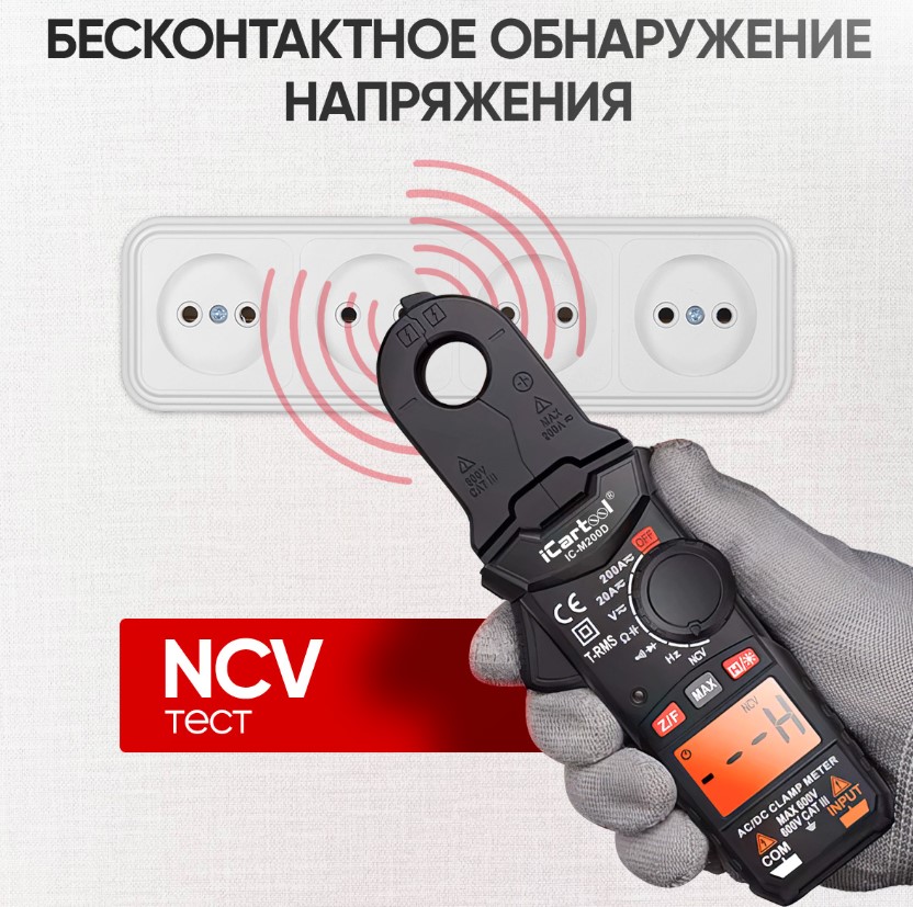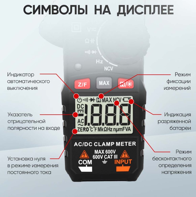 Большой ЖК-дисплей с разрешением 2000 разрядов и индикацией полярности четко отображает измеряемые параметры и их значения. Цветовая подсветка и режим NCV расширяют возможности использования устройства. Узкие зажимы обеспечивают надежное захватывание тонких проводников, что повышает точность измерений, особенно при работе с проводниками вблизи других объектов. Прибор использует измерение истинных среднеквадратичных значений (True RMS), что гарантирует максимальную точность показаний.