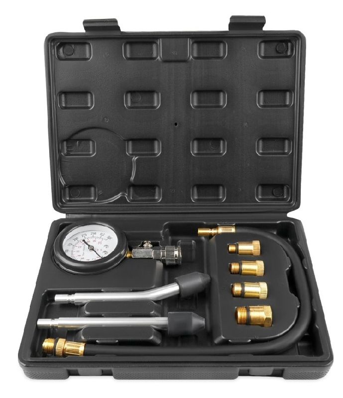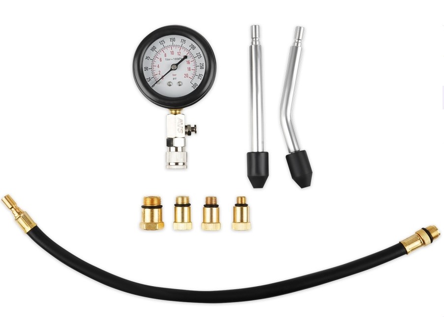 Компрессометр подключается к свечному отверстию цилиндра. При прокрутке двигателя стартером (с отключенным зажиганием) прибор фиксирует максимальное давление в цилиндре. Гибкий шланг позволяет проводить измерения без демонтажа оборудования, препятствующего измерениям.