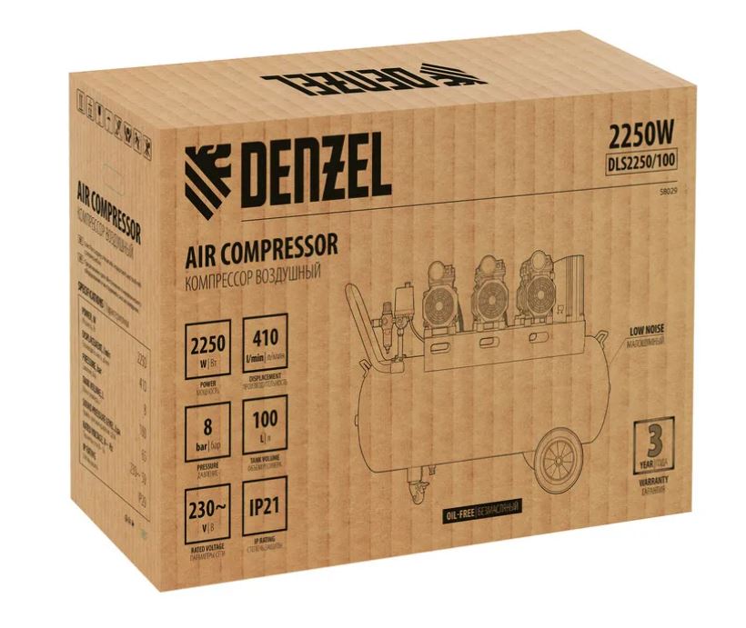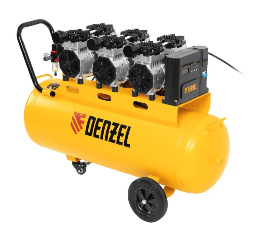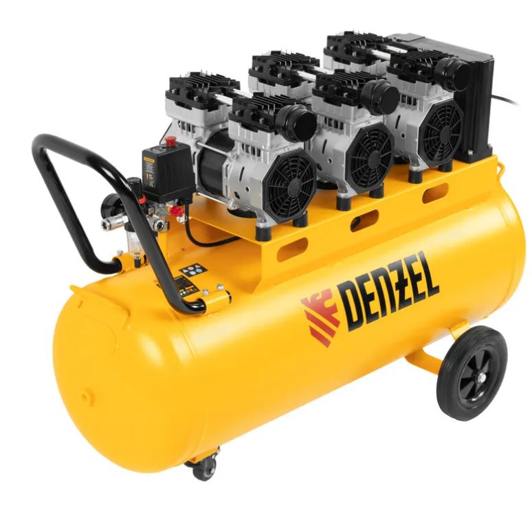 Безмасляный малошумный компрессор Denzel DLS 2550/100 предназначен для обеспечения пневмоинструмента сжатым воздухом, подаваемым под давлением до 8 бар.