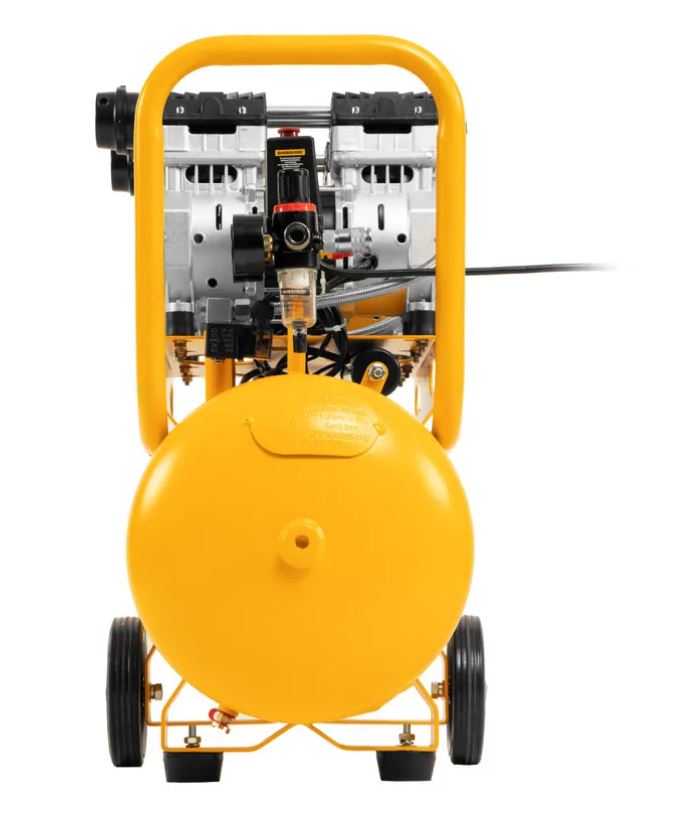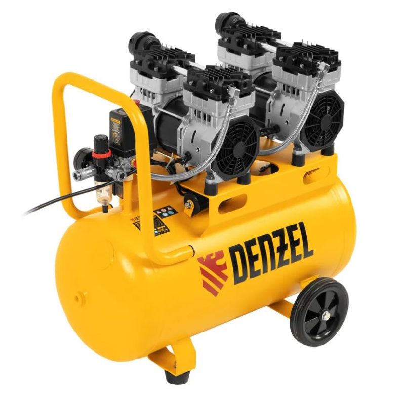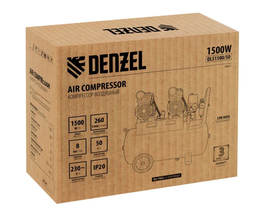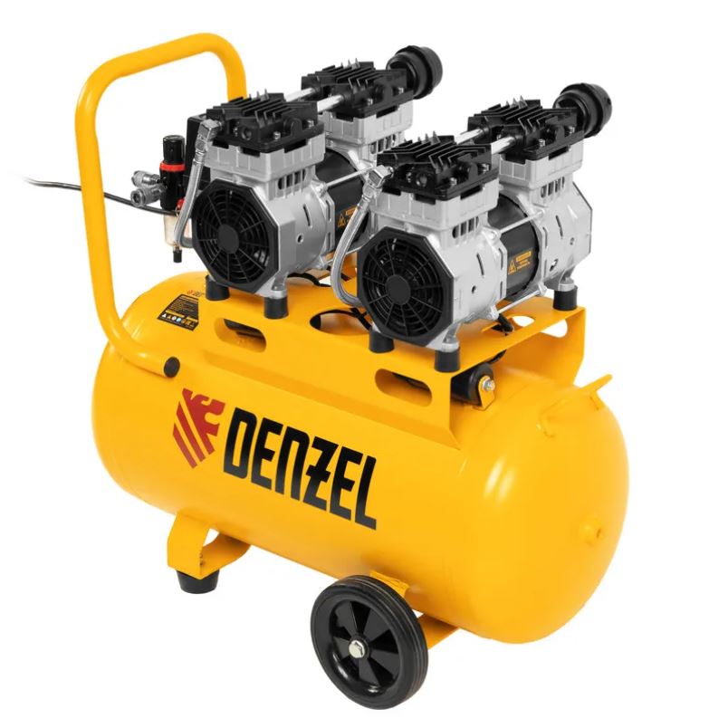Безмасляный малошумный компрессор Denzel DLS 1500/50 58027 мощностью 1500 (2 х 750) Вт, объемом ресивера 50 л и производительностью 260 л/мин предназначен для обеспечения пневмоинструмента сжатым воздухом, подаваемым под давлением до 8 бар.