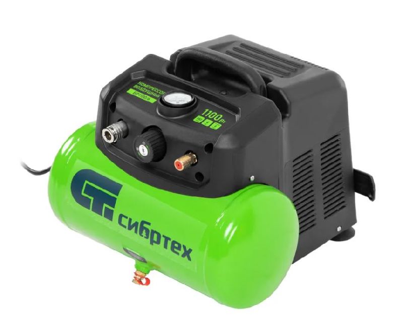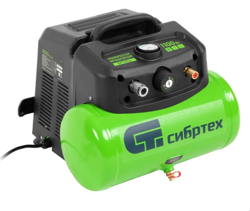 Воздушный безмасляный компрессор Сибртех BL 1100/6 58059 мощностью 1100 Вт, с ресивером емкостью 6 литров, служит для подачи сжатого воздуха под давлением до 8 бар со скоростью 180 л/мин.