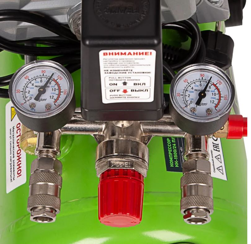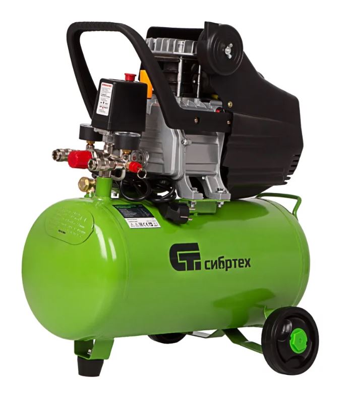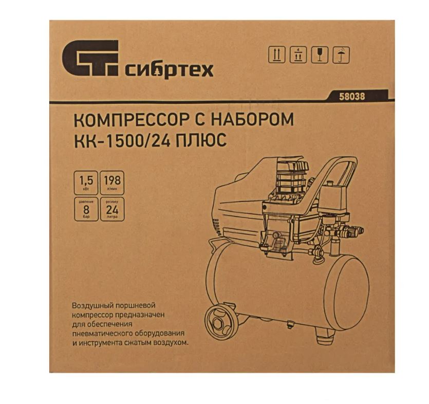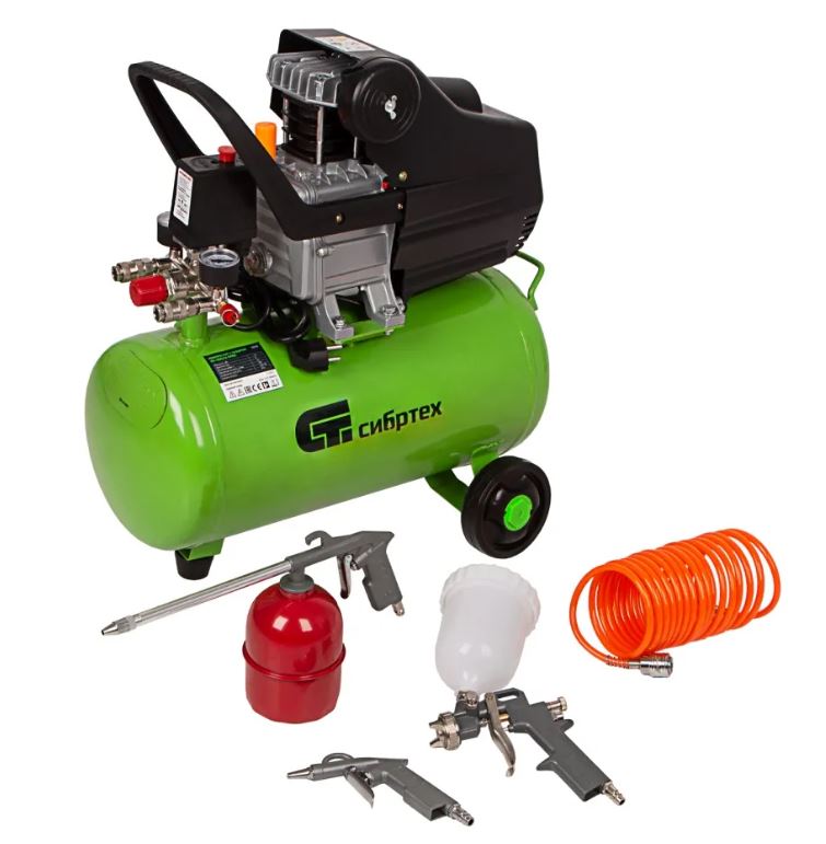 Компрессор Сибртех КК-1500/24 ПЛЮС относится к бытовому типу и для работы использует однофазную сеть. Устройство комплектуется краскораспылителем, продувным и моечным пистолетами и 5-метровым спиральным шлангом.