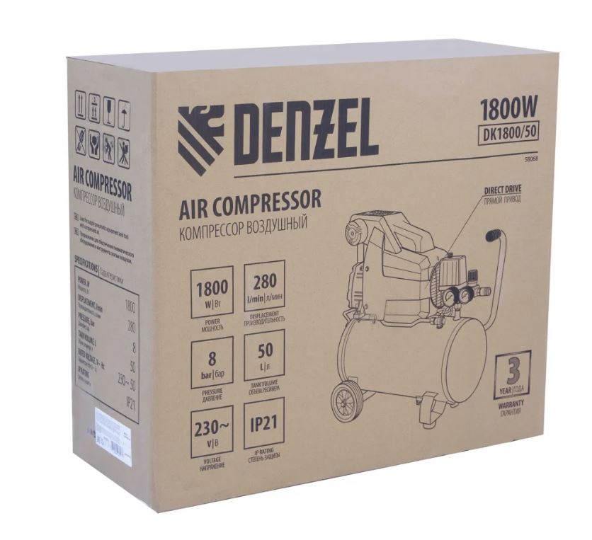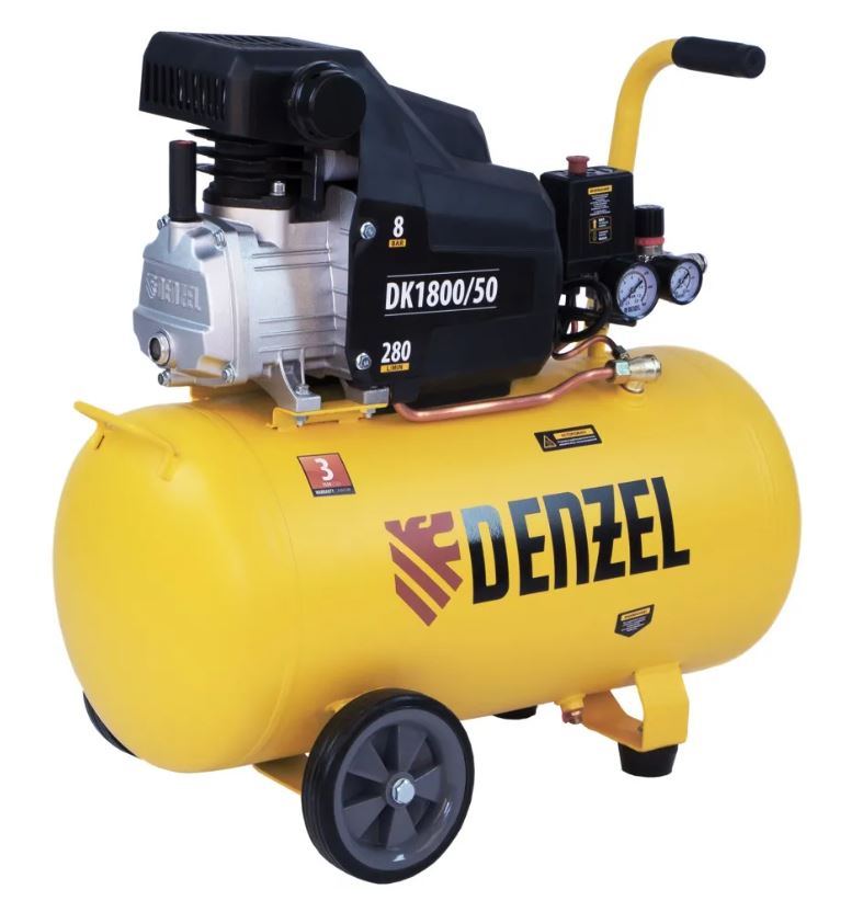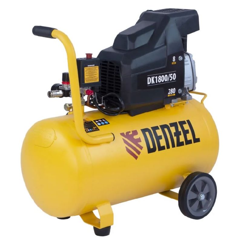 Воздушный компрессор Denzel Х-PRO DK1800/50 58068 мощностью 1,8 кВт, производительностью 280 л/мин, имеет ресивер объемом 50 л и подходит для бытового использования. Обеспечивает подачу воздуха к различным пневматическим инструментам: продувочному пистолету, краскопульту и др. Будет незаменим в гараже, когда надо подкачать колеса автомобиля или подкрасить его отдельные детали, а также на даче или в частной мастерской. Несмотря на простую конструкцию, компрессор имеет хорошую производительность и возможность подключения сразу нескольких инструментов.