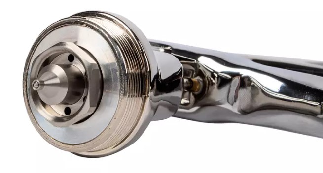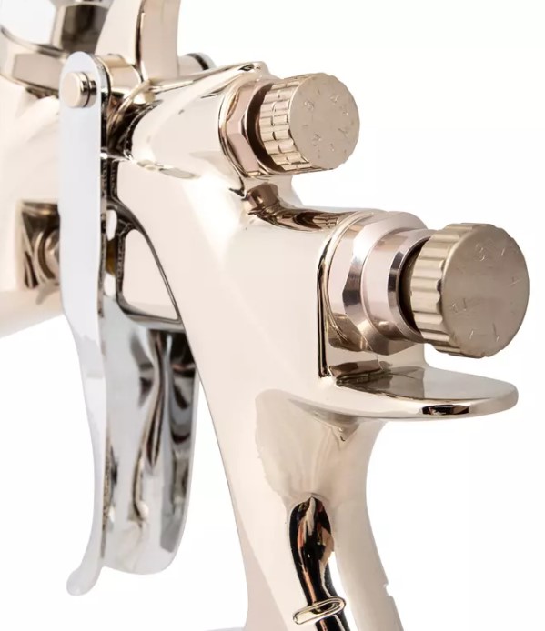Он работает по технологии HVLP, имеет дюзу размером 1,3 мм и бачок емкостью 0,6 литра. Подходит для нанесения базовых покрытий.