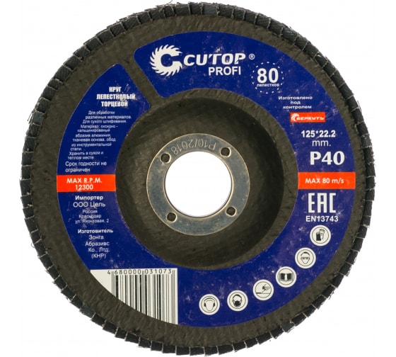 Круг наждачный лепестковый Cutop 70-12540 используется для профессионального и повседневного использования. Абразивный материал - кальценированный оксид алюминия, 80 лепестков, угол наклона 10 градусов, 100% КПД, повышенная износостойкость.