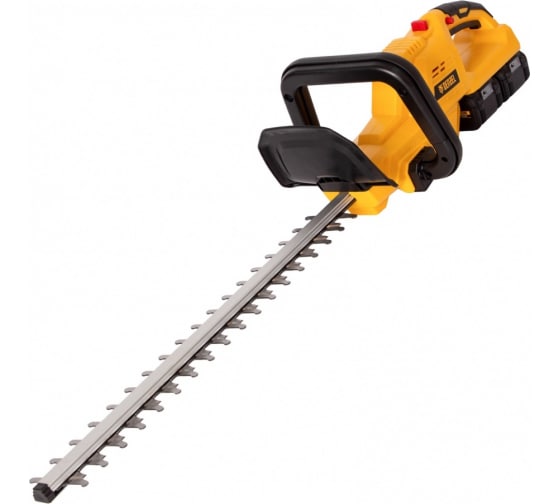 Аккумуляторный кусторез Denzel RBC510-36 59410 с двумя Li-Ion батареями емкостью 4 Ач и суммарным напряжением 36 В, с поворотной ручкой, используется для стрижки кустарников и тонких веток деревьев, подрезания дикой поросли травы.
