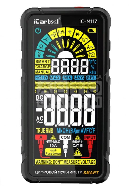 Интеллектуальный цифровой мультиметр с автоматическим выбором режима измерения, большим многофункциональным цветным дисплеем, широким набором дополнительных функций и встроенным Li-ion аккумулятором. Имеет разрядность дисплея 6 000 отсчетов и рейтинг электробезопасности CAT III 600V. Работает в режиме TrueRMS.