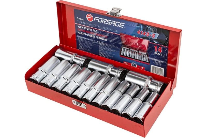 Комплект торцевых головок FORSAGE размером 1/2" в количестве 14 штук предназначен для работы с шестигранными болтами и гайками. Благодаря особой конструкции профиля, головки можно использовать даже в труднодоступных местах.