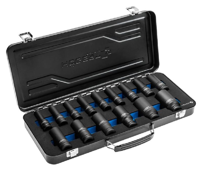 Комплект ударных глубоких шестигранных головок (15 единиц; 1/2; CrMo) от HOEGERT TECHNIK HT4R049 подходит для работы с резьбовыми соединениями, что делает его идеальным инструментом для ремонта и обслуживания.