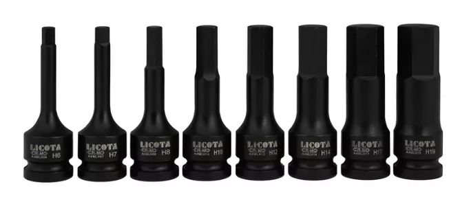 Набор ударных шестигранников Licota ASA-40001 из хром-молибденовой стали, состоящий из 8 внешних шестигранников размером от 6 до 19 мм. Комплект предназначен для монтажа резьбового крепежа и чаще всего используется при работе с ударным гайковертом. Размер привода составляет ½ дюйма (12,7 мм). Набор применяется для сборки и разборки промышленного оборудования и узлов автомобиля с соответствующим типом головки, где необходимо срывать "закисший" крепеж.