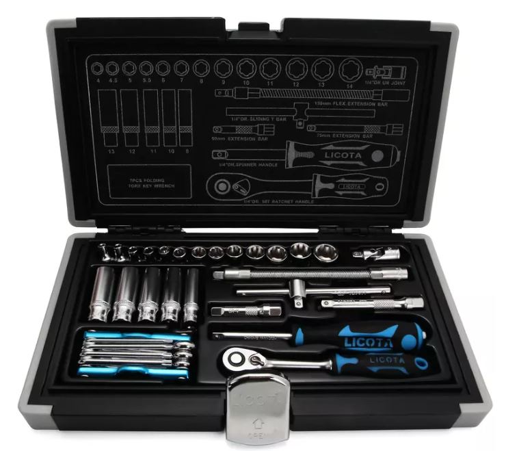 Набор Licota ALK-0004 включает 32 предмета для ручного монтажа и демонтажа резьбового крепежа. В наборе имеются стандартные и глубокие шестигранные головки размером от 4 до 14 мм, а также набор раскладных ключей Torx размерами от Т10 до Т40. Все инструменты надежно хранятся в прочном пластиковом кейсе.
