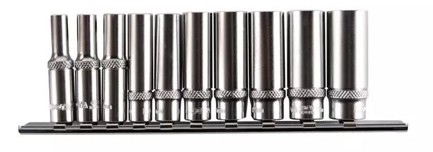 Набор из 10 глубоких торцевых головок Licota TBS-23101, изготовленных из прочного хром-ванадиевого сплава, идеально подходит для ручного монтажа и демонтажа резьбового крепежа. Этот набор поставляется с металлическим держателем-линейкой для удобного хранения и быстрого доступа к нужным головкам.