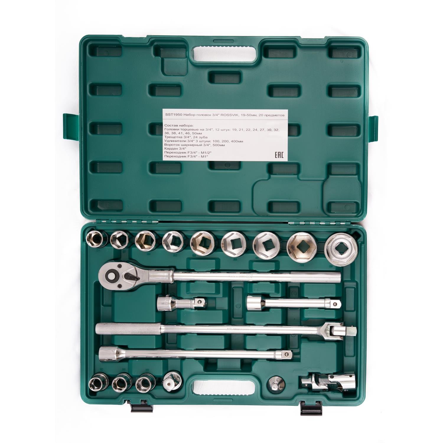 Головки торцевые на "3/4", мм: 19; 21; 22; 24; 27; 30; 32; 36; 38; 41; 46; 50 - 12 шт;