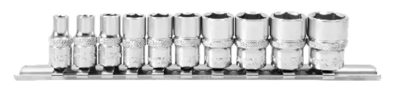Набор торцевых головок Licota TBS-22103 из хром-ванадиевой стали идеально подходит для ручного монтажа и демонтажа резьбового крепежа. В наборе 10 предметов, удобно расположенных на металлическом держателе-линейке.