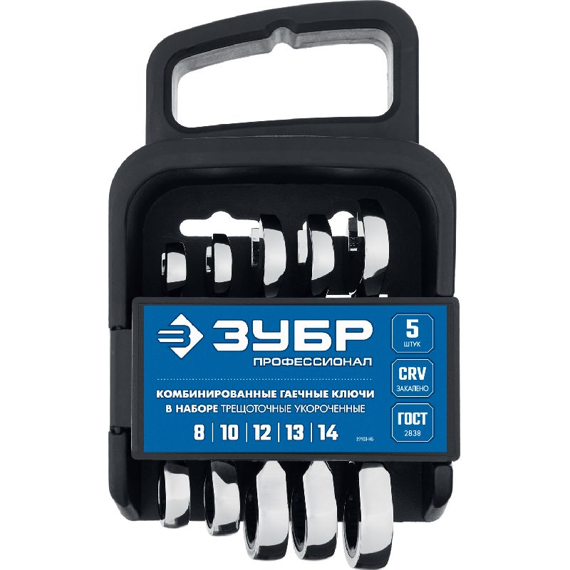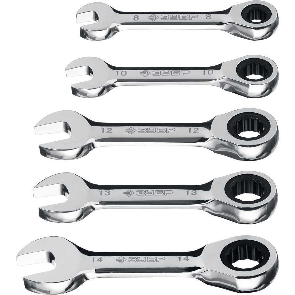 Набор трещоточных комбинированных гаечных ключей Зубр (5 шт, 8-14 мм) облегчает работу с крепежом и подходит для использования в домашних условиях и в мастерской.