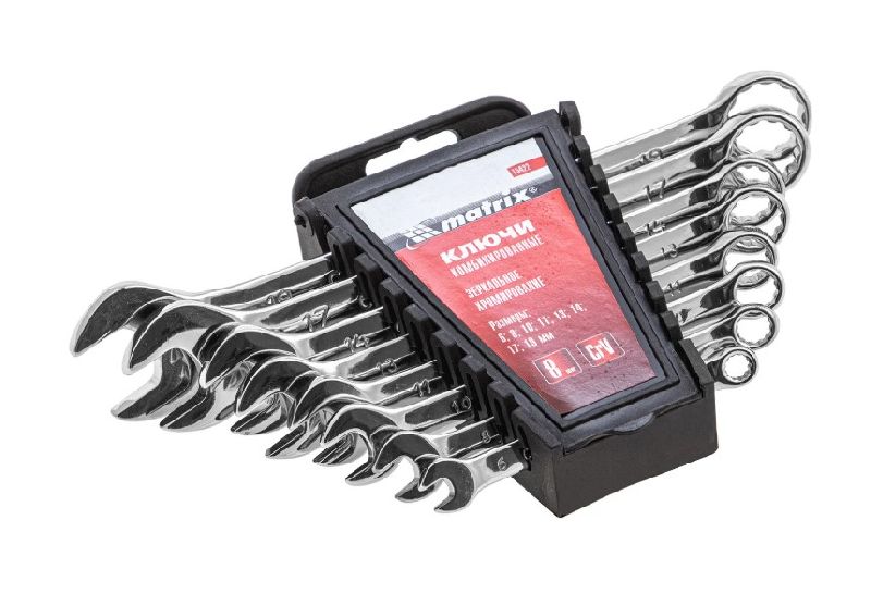Набор Matrix 15422 включает 8 комбинированных ключей из стали CrV, размером 6-19 мм, с покрытием «полированный хром», которые пригодятся во время ремонтных работ дома или в гараже. С их помощью можно быстро монтировать и демонтировать крепежные элементы. В набор входят инструменты основных типоразмеров, позволяющие эффективно решать поставленные задачи.