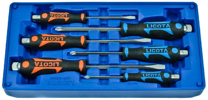 Набор цельнометаллических отверток Licota ACK-B3005 состоит из 6 предметов, удобно размещенных в ложементе-кейсе. В комплект входят 3 отвертки с профилем SL (шлиц) и 3 отвертки с профилем PH (крест).