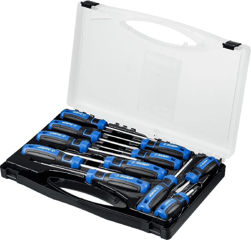 Набор отверток ЗУБР Профессионал-11 в кейсе, состоящий из 11 предметов (артикул 25241), предназначен для монтажа и демонтажа резьбовых соединений.