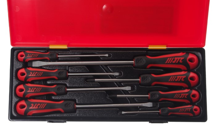 Набор отверток JTC K7086 состоит из 8 предметов и идеально подходит для монтажных и демонтажных работ, где используются крепежные соединения с прямым и крестовым шлицем. Инструменты оснащены прочными стержнями и эргономичными рукоятками, что обеспечивает удобство и комфорт при работе. Набор поставляется в компактном и удобном кейсе для легкой транспортировки и хранения.