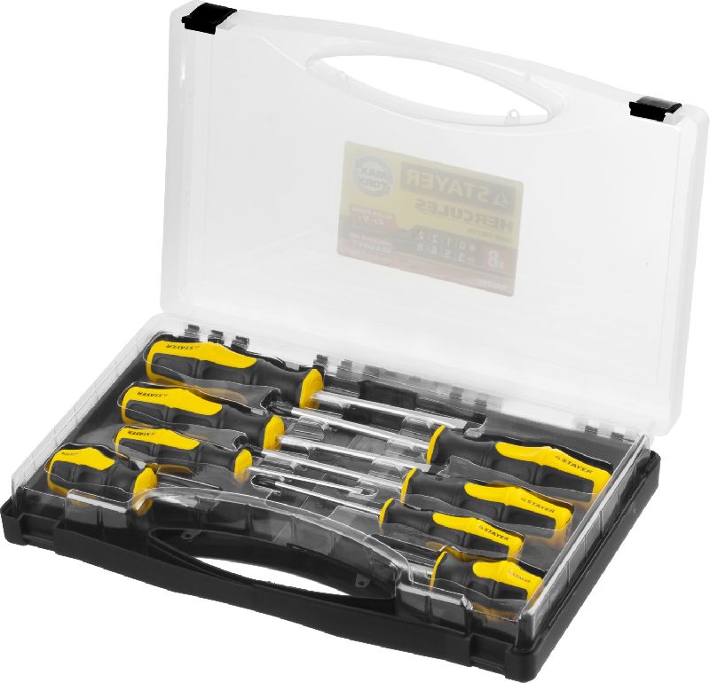 Набор отверток STAYER MASTER HERCULES Cr-V с эргономичной двухкомпонентной ручкой, содержащий 8 шт., модель 25055-H8_z02, идеально подходит для монтажа и демонтажа резьбовых соединений. Благодаря своему дизайну, этот набор отверток удобен для бытовых и для профессиональных задач.
