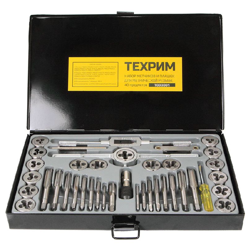 Набор метчиков и плашек T030001 — это универсальный инструмент, предназначенный для восстановления поврежденных и нарезания новых внутренних и наружных резьб. В комплект входят 40 предметов, изготовленных из стали 9ХС с матовым покрытием.