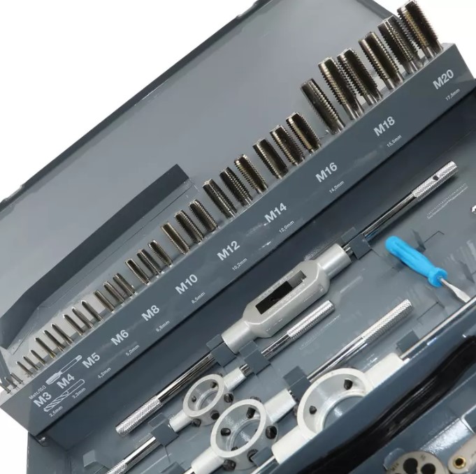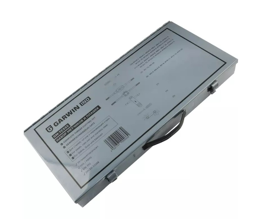 Набор метчиков и плашек GARWIN GM-TCS44, изготовленный из инструментальной быстрорежущей стали HSS, предназначен для нарезания метрической резьбы размером от М3 до М20.