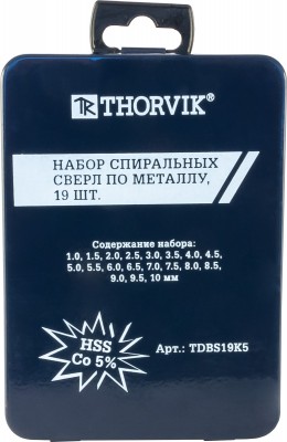 В металлическом кейсе вы найдёте 19 спиральных свёрл по металлу HSS Co с диаметром от 1 до 10 мм.