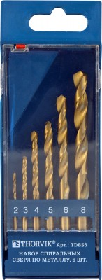 В комплект входит 6 спиральных свёрл по металлу HSSTiN, изготовленных из быстрорежущей инструментальной стали с высоким содержанием легирующих элементов. Это позволяет эффективно обрабатывать материалы с высокой твёрдостью.