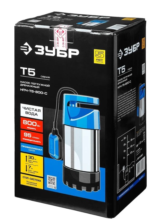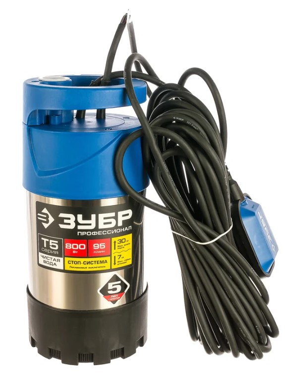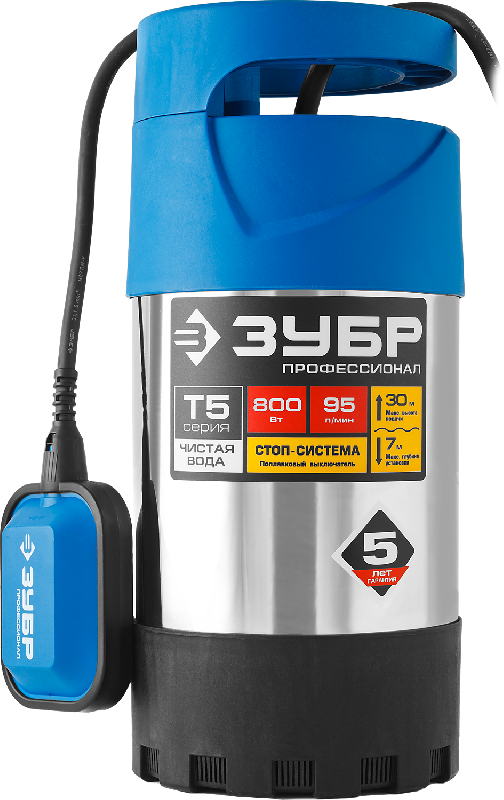 Погружной дренажный насос ЗУБР ПРОФЕССИОНАЛ Т5 НПЧ-Т5-800-С служит долго. Он подходит для садовых работ, поднимая воду из колодцев и осушая емкости. Насос оснащен 15-метровым кабелем для удобной установки. Поплавковый выключатель предотвращает работу "на сухую".