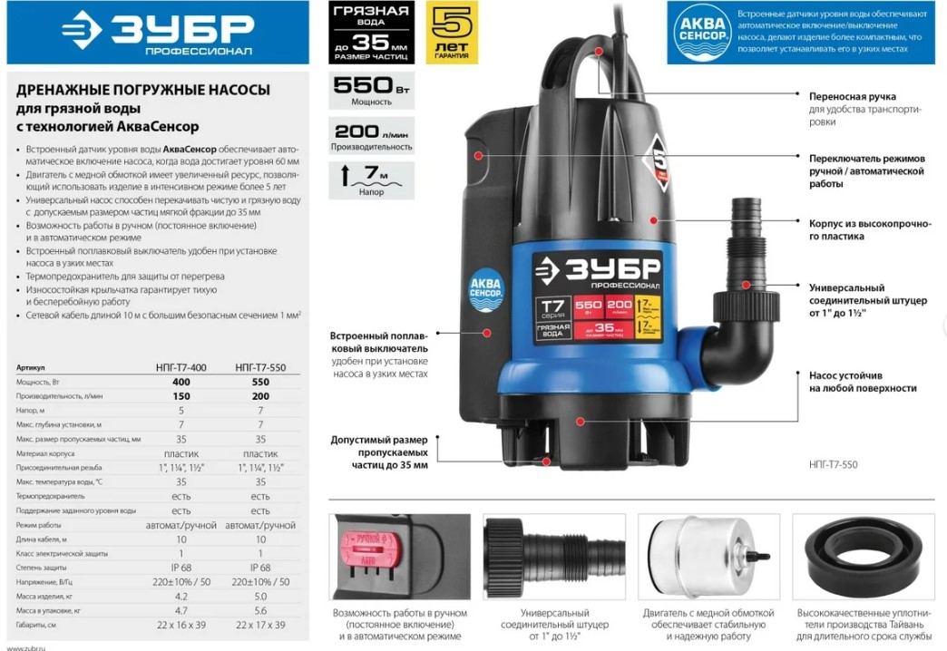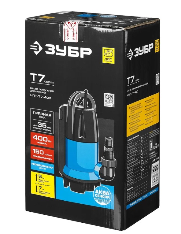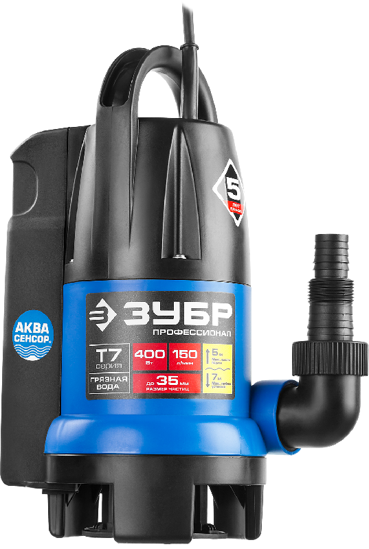 Погружной насос для грязной воды «Зубр Профессионал Т7 АкваСенсор НПГ-Т7-400» — это надёжное устройство, которое оснащено встроенным датчиком уровня воды. Оно предназначено для перекачивания воды с мягкими частицами размером до 35 мм.