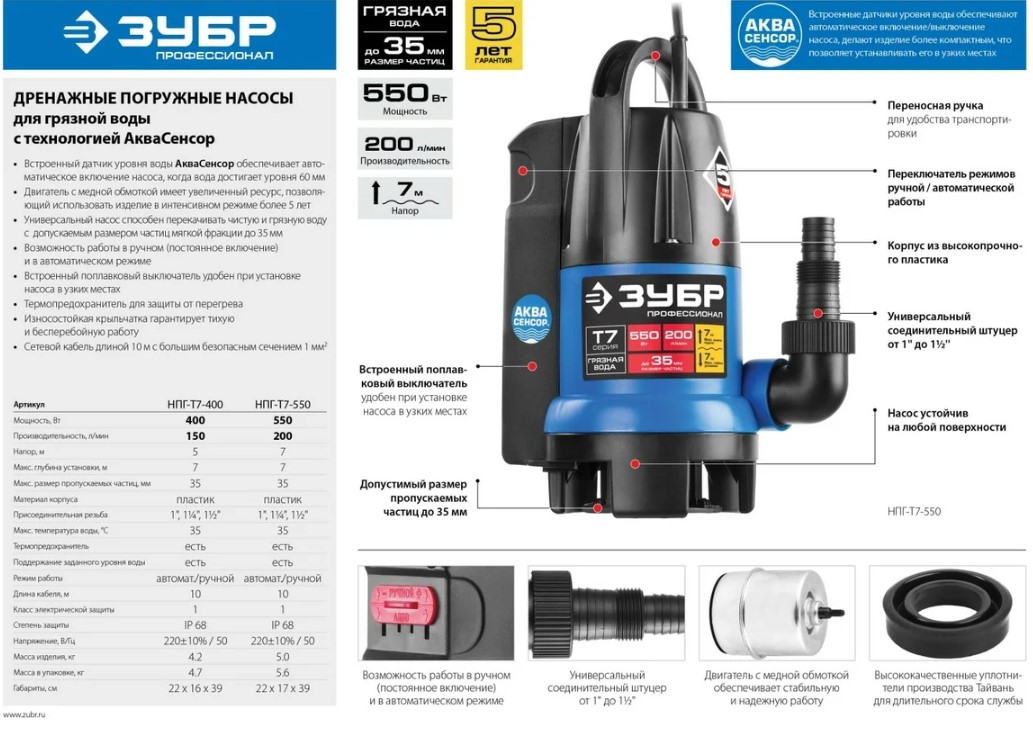 Профессиональный дренажный насос ЗУБР АкваСенсор НПГ-Т7-550 предназначен для работы с грязной водой. Он обладает высокой производительностью и может работать как в ручном, так и в автоматическом режиме.
