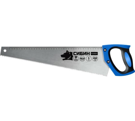 Ножовка по дереву шаг 5 TPI 4.5 мм 450 мм СИБИН - ручной инструмент, применяется для распила древесных пород. Полотно ножовки изготовлено из пружинной высокоуглеродистой стали. Зубья с твердость 50 HRC закалены для максимальной износостойкости и долгой службы. Для остроты рабочую часть обрабатывают алмазной заточкой. На приспособлении имеется линейная шкала для точных измерений. Двухкомпонентная ручка удобной формы предотвращает скольжения во время рабочего процесса.